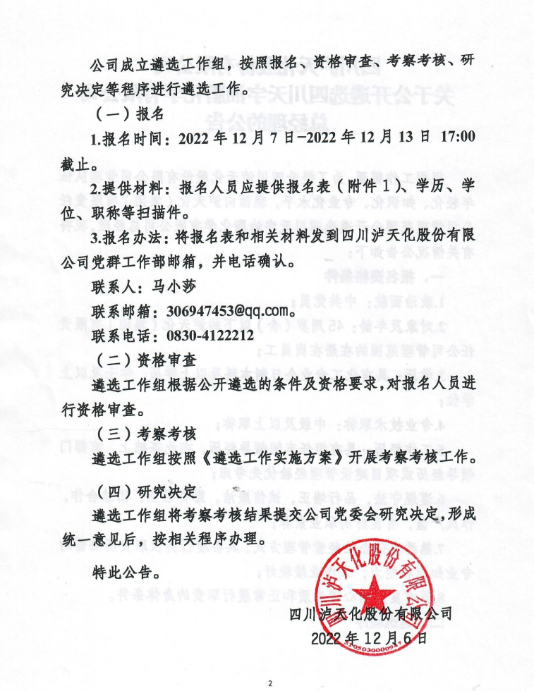 关于公开遴选四川天宇油脂化学有限公司总经理的公告